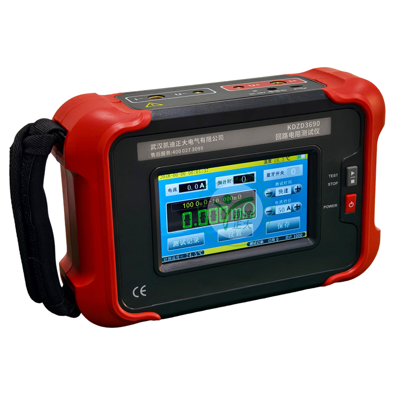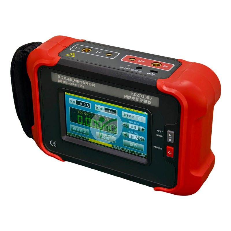 KDZD3690 手持式回路電阻測試儀根據(jù)人體工程學(xué)原理設(shè)計,手感舒適,特殊設(shè)計的機體結(jié)構(gòu)具有絕緣、封閉,防漏電、防風(fēng)沙,減震防護等功能。儀表采用高亮度5寸觸摸彩屏,操作簡易快速功能直達,字符清晰明亮,中英文顯示界面。儀表有多檔測試電流可選,儀表顯示當(dāng)前檔位的測試范圍,用戶可自行選擇電流檔位及測試時間,滿足用戶不同場合的要求。