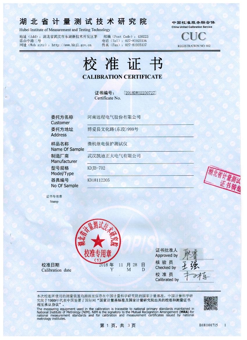 湖北省計(jì)量測(cè)試技術(shù)研究院是政府計(jì)量行政管理部門依法設(shè)立的法定計(jì)量檢定機(jī)構(gòu),本次校準(zhǔn)的技術(shù)依據(jù)是參照J(rèn)JG 1112-2015繼電保護(hù)測(cè)試儀,校準(zhǔn)所使用的主要計(jì)量設(shè)備數(shù)字多用表,型號(hào)/編碼:8508A,校準(zhǔn)環(huán)境溫度20.2度,相對(duì)濕度40度,校準(zhǔn)數(shù)據(jù)結(jié)果符合國(guó)家電力預(yù)試設(shè)備標(biāo)準(zhǔn)。