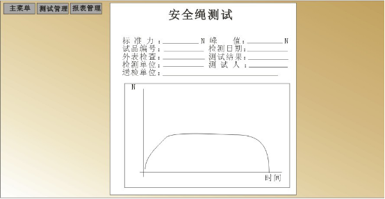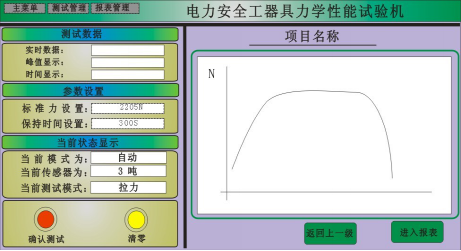參數(shù)設(shè)置。這里要特別查看(當(dāng)前狀態(tài)顯示)的內(nèi)容,確認(rèn)是否是自動模式,傳感器是否符合試驗的量程,還有是否是拉力測試,確認(rèn)無誤后再做下面的事情;清零按鈕用于清除初始值。然后點擊確認(rèn)測試按鈕開始測試,但系統(tǒng)力值到達(dá)設(shè)定值的20%時,系統(tǒng)會自動停止,此過程為預(yù)緊過程,若此過程有出現(xiàn)較大的變動,可能由于夾具沒夾緊,此時試驗人員可根據(jù)具體的現(xiàn)象進行檢查,若沒有問題試驗人員用鼠標(biāo)點擊繼續(xù)測試,設(shè)備繼續(xù)加載力值,測試數(shù)據(jù)欄中會顯示當(dāng)前狀態(tài)的受力情況,當(dāng)拉力力值達(dá)到設(shè)置的力值時,開始自動計時,設(shè)備開始保持力,力值不過沖。同時右邊的實時曲線將記錄實時力值與時間的曲線。計時完成后設(shè)備自動卸載力,關(guān)閉電磁閥,關(guān)閉油泵,測試結(jié)束。鼠標(biāo)點擊進入報表按鈕進入報表界面。