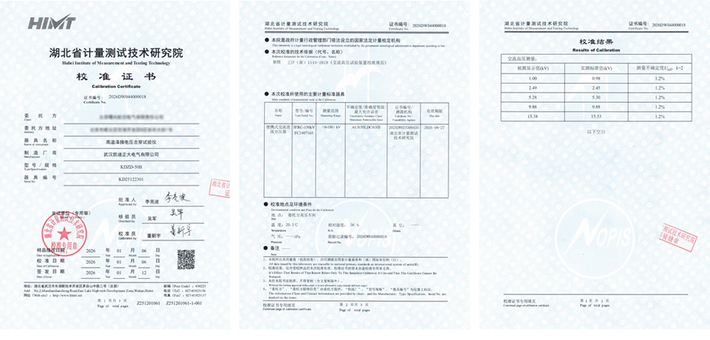 整體性能可靠:數(shù)據(jù)表明,KDZD-50B型試驗(yàn)儀在其量程范圍內(nèi),測(cè)量結(jié)果準(zhǔn)確、穩(wěn)定,系統(tǒng)誤差小,具備了為高端絕緣材料測(cè)試提供可靠數(shù)據(jù)的能力。湖北省計(jì)量測(cè)試技術(shù)研究院出具的校準(zhǔn)證書確認(rèn),該臺(tái)KDZD-50B高溫漆膜電壓擊穿試驗(yàn)儀的交流高壓測(cè)量功能符合預(yù)期使用要求,量值準(zhǔn)確可靠。
